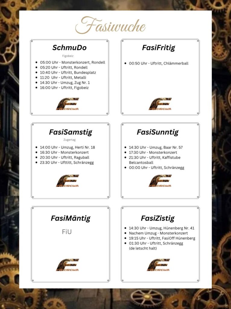 Figo-Tour Datum Event 28.12.2025 Abschlussprob, i45 03.01.2026 Grühüball, Allenwinden 10.01.2026 Guuggertreffen Willisau, Willisau 17.01.2026 Scampiball, Zug 23.01.2026 Fasieröffnung, Cham 24.01.2026 Contiball, Zug 31.01.2026 Profis-Ohrium, Baar 06.02.2026 Straccerball, Steinhausen 12.02.2026 Chesslete / Schmudo, Zug 13.02.2026 Chlämmerball, Hünenberg 14.02.2026 Hertiumzug, Zug 15.02.2026 Baarerumzug / Belcantosball, Baar 16.02.2026 Fiu 17.02.2026 Hünenbergumzug / Fasioff, Hünenberg